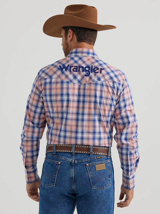 MEN'S WRANGLER® LOGO LONG SLEEVE WESTERN SNAP SHIRT IN ORANGE BLUE PLAID