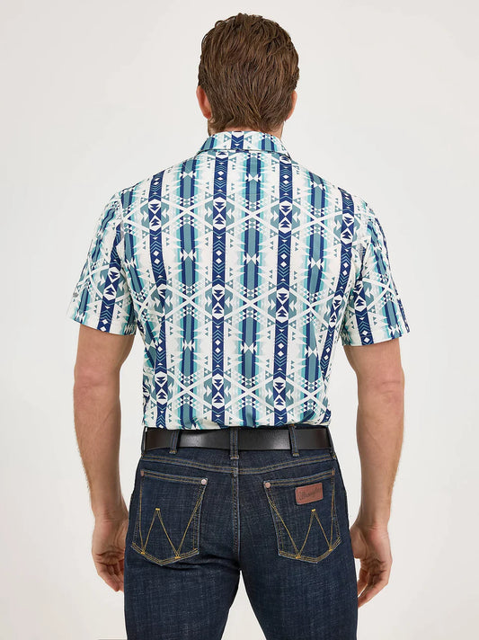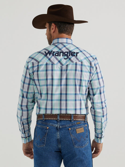 MEN'S WRANGLER® LOGO LONG SLEEVE WESTERN SNAP SHIRT IN AQUA PRINT